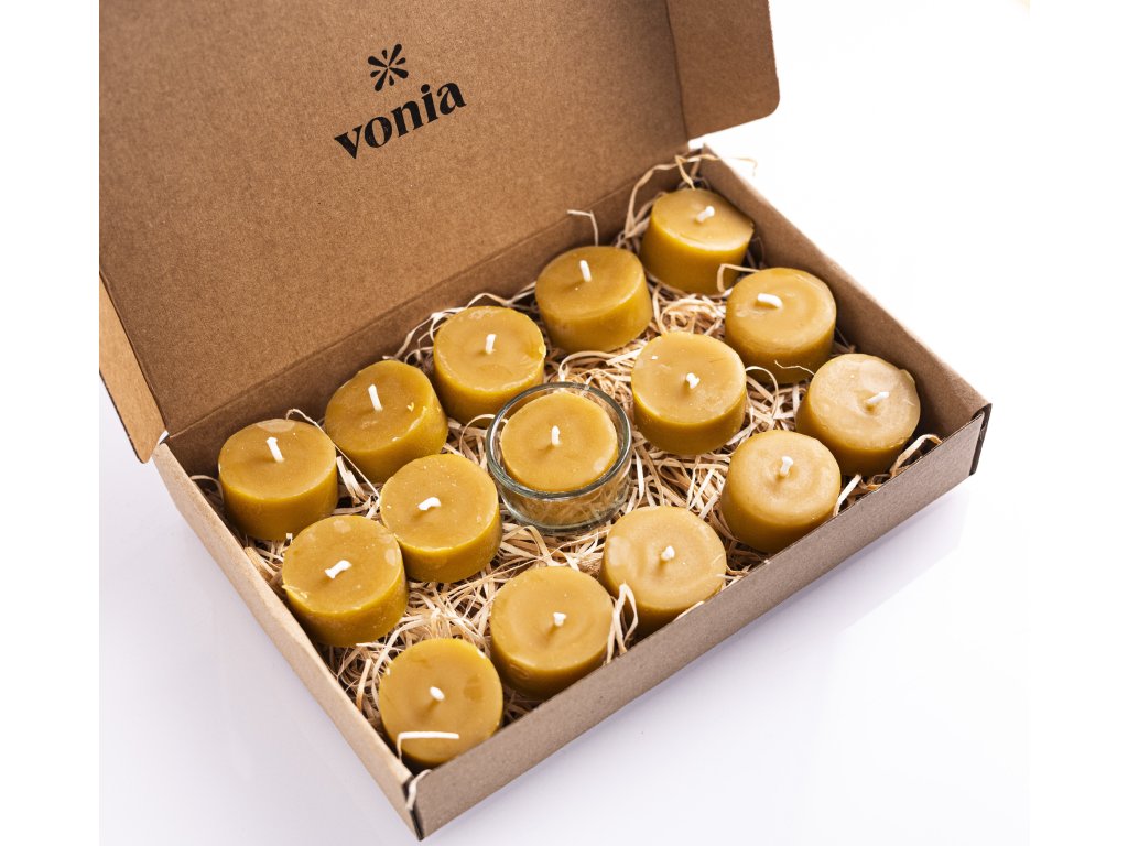 Praktický balíček zerowaste čajových sviečok obsahuje 1 sklenený svietnik + 15 čajových sviečok z včelieho vosku bez hliníkových obalov. Zabalené v papierovej krabičke, vystlanej darčekovou slamou.